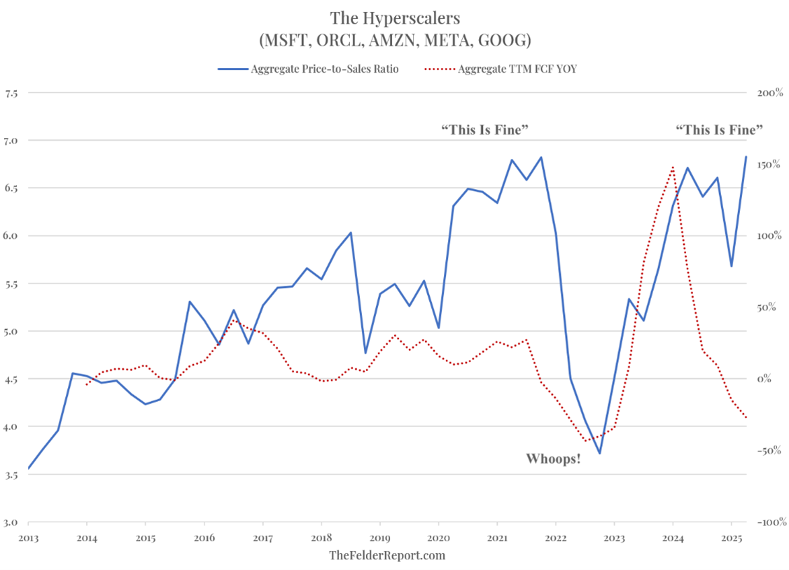 Det betyder også techgiganter, der lige nu prises til rekordhøje vurderinger (blå linie i grafen nedenfor), men hvor de frie pengestrømme – dvs. hvor mange penge er der tilbage til aktionærerne efter omkostninger og giga-investeringerne er trukket fra – nu begynder for første gang at falde (rød linie i grafen nedenfor).