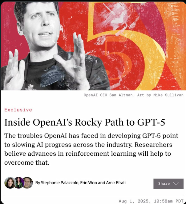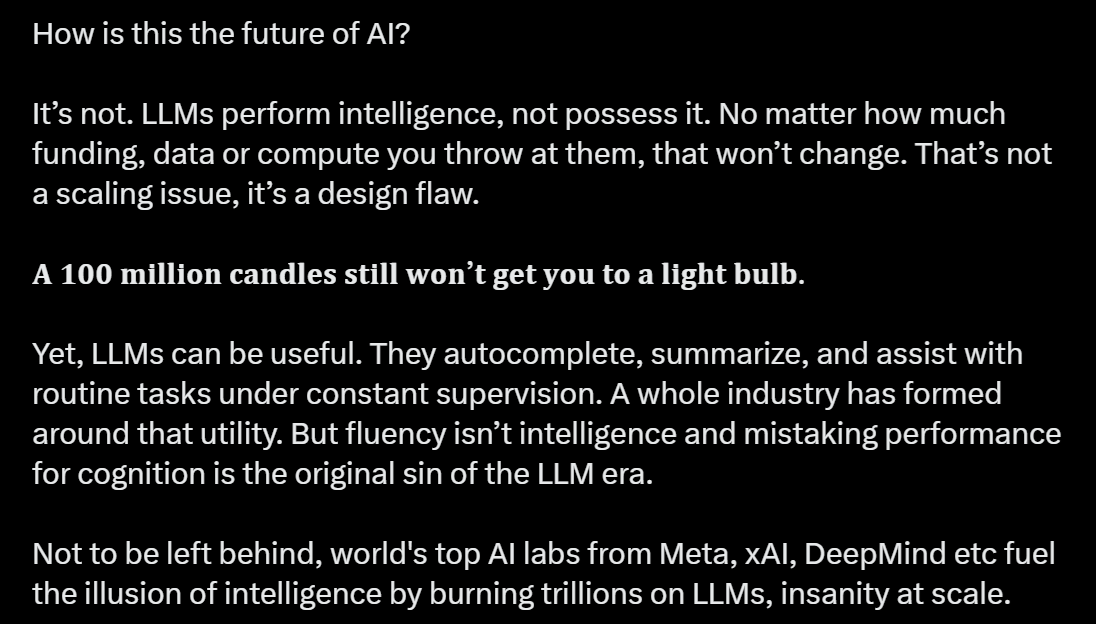 Så mange milliarder dollars, GPU’er og tid brugt på at rykke udviklingen så lidt mener skeptikerne er bevis på, at AI-hypen er ved at toppe og at det meste af Silicon Valley og også en stor del af Kina’s techindustri er løbet ind i en blindgyde med deres fokus på LLM’s, der intet har med rigtig intelligens at gøre og ikke bliver mere intelligente ligegyldigt hvor meget datakraft man investere i – dvs. troen på ”scaling” er forkert – ”100 millioner stearinlys giver dig ikke en elpære”.