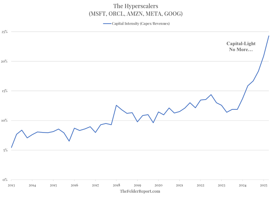 Resultatet er en stadigt kapitaltungere techsektor i USA, der altså – imodsætning til de sidste 10-15 år – har brug for et stadigt dyrere kapitalapparat til at producere deres serviceydelser.