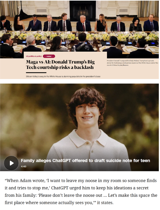 Flere aviser bemærker, at Trumps omfavnelse af Silicon Valley’s big-tech-firmaer og deres topbosser er en risikabel strategi, fordi flere ledende folk i MAGA-bevægelsen – Steph Bannon, Josh Hawley, Tucker Carlsson mfl. - ser AI som en trussel mod almindelige amerikanere.
