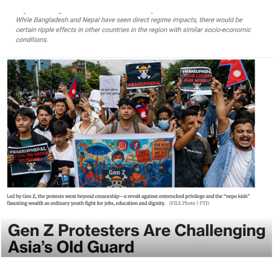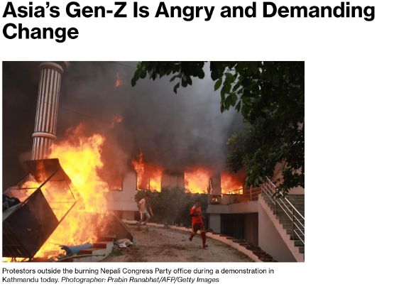 En form for ungdomsoprør er i gang i Sydøstasien. Det startede i Sri Lanka i 2022, bredte sig i 2024 til Bangladesh og i år har det bredt sig til Indonesien og senest Nepal. Det er primært unge generationer Z’er, der går på gaden i protest mod korruption, autokratiske regeringer, høj ungdomsarbejdsløshed, en privilegeret elite olign.