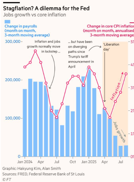Markedet priser lige nu det positive ”Guldlok”-scenarie i kurserne og forventer altså, at den nuværende stagflationære trend i makrodata i USA (se graf nedenfor der viser stigende inflation og lavere vækst i USA = stagflation) kun er midlertidig. Det er heller ikke usandsynligt med tanke på, at budgetunderskuddet fortsat er gigantisk (= pengene fosser ud af statskassen) og skattelettelser sender en del penge tilbage til amerikanerne allerede til januar.