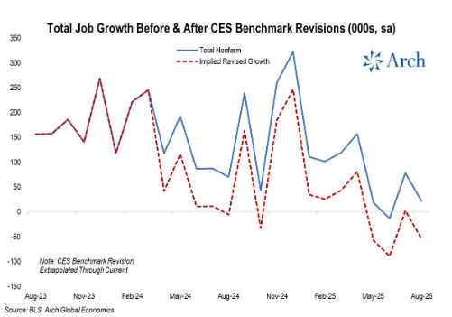 Det evige spørgsmål for investorerne er, om USA er på vej i en recession eller ej? Analytikere fra Arch Global Economics har taget de seneste markante ned-revisioner til de amerikanske jobtal for perioden marts 2024 til marts 2025 og videreført dem til tallene for april-august 2025 under antagelse om, at de seneste jobtal nedjusteres lige så meget.