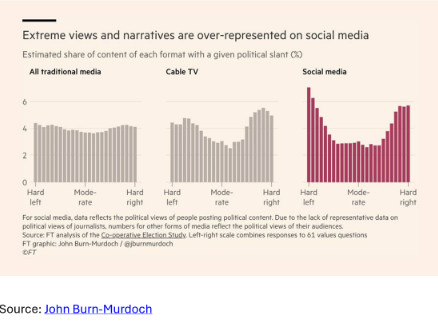 Derfor er det heller ikke overraskende, at forskning viser, at sociale mediers algoritmer sikre markant overrepræsentation af ekstreme politiske holdninger, mens de traditionelle medier har en mere ligelig fordeling af politiske budskaber (se grafer nedenfor).