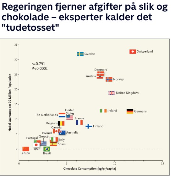 Fjernelsen er selvfølgelig for at øge danskernes chokolade-indtag, så vi kan få en nobelpristager mere jævnfør den statistiske sammenhæng i grafen nedenfor. Ifølge mine beregninger vil bare 400 gram mere fra hver af os udløse en yderligere nobelpris.