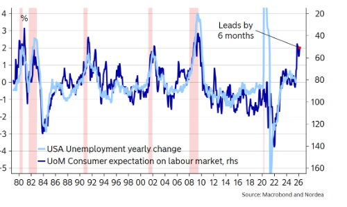 At den faktiske jobudvikling har været markant svagere i 2024/25 end de første officielle jobtal viste, kunne også forklare, hvorfor amerikanerne lige nu er lige så negative i deres syn på jobmarkedet som under finanskrisen i 2008/09 og forudser markant stigende arbejdsløshed de næste 12 måneder (blå linie i grafen nedenfor måler deres vurdering, lyseblå linie viser årlig ændring i arbejdsløsheden).