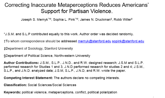 Nedenstående studie fra 2022 viste meget interessant, at republikanske og demokratiske vælgere i USA overvurderede deres politiske modstanderes støtte til politisk vold med 239-489% (mindre end 5% af amerikanerne går ind for politisk vold viser andre analyser).