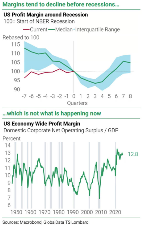 Men igen: Det passer bare slet ikke på, at virksomhederne lige har leveret regnskaber for 2. kvartal med fortsat meget høje overskudsgrader (= margins på engelsk). De plejer altid at falde før recessionen rammer.