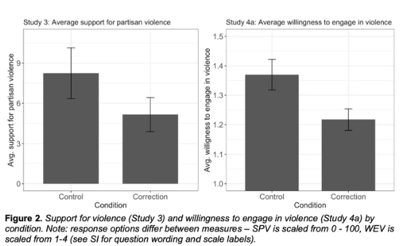 Ydermere viste studiet, at får vælgerne de rigtige tal mht. modstandernes markant lavere støtte til politisk vold, så falder deres egen støtte til politisk vold med 37-44% (se grafen nedenfor). Så støtten til politisk vold i USA skyldes i høj grad en overvurdering af modpartens voldsparathed - især pga. sociale medier - og støtten til politisk vold kan generelt sænkes ved at bibringe vælgerne de rigtige tal om deres modstandere.
