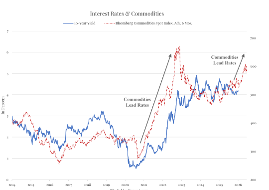 Nogle inflations-pessimister fremhæver nedenstående sammenhæng mellem råvareprisstigninger og stigende renter 6 måneder senere og forventer derfor, at efter en længere periode med stabile renter, så er den næste bevægelse i de lange renter opad.