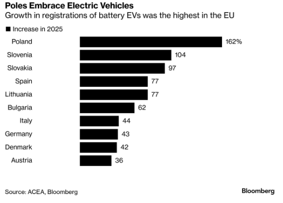 Salget af elbiler stiger kraftigere end ventet i Europa. I 2025 steg salget med 30% i hele EU og 42% i Danmark. Fremgangen var dog kraftigst i Østeuropa og især Polen med en vækst på hele 162%.