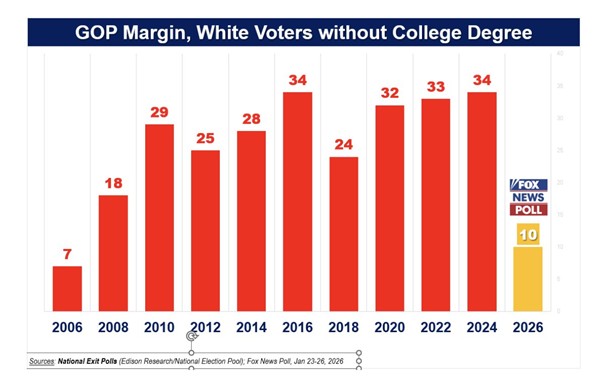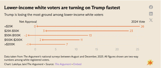 Trump og republikanerne er i store vælgerproblemer. Deres meningsmålinger dykker og faldet er taget til i januar pga. især de voldsomme episoder med ICE-agenter. Mange unge som Trump overraskende vandt over på sin side ved valget i 2024 vender ham hastigt ryggen, det samme med fx. latinoer.