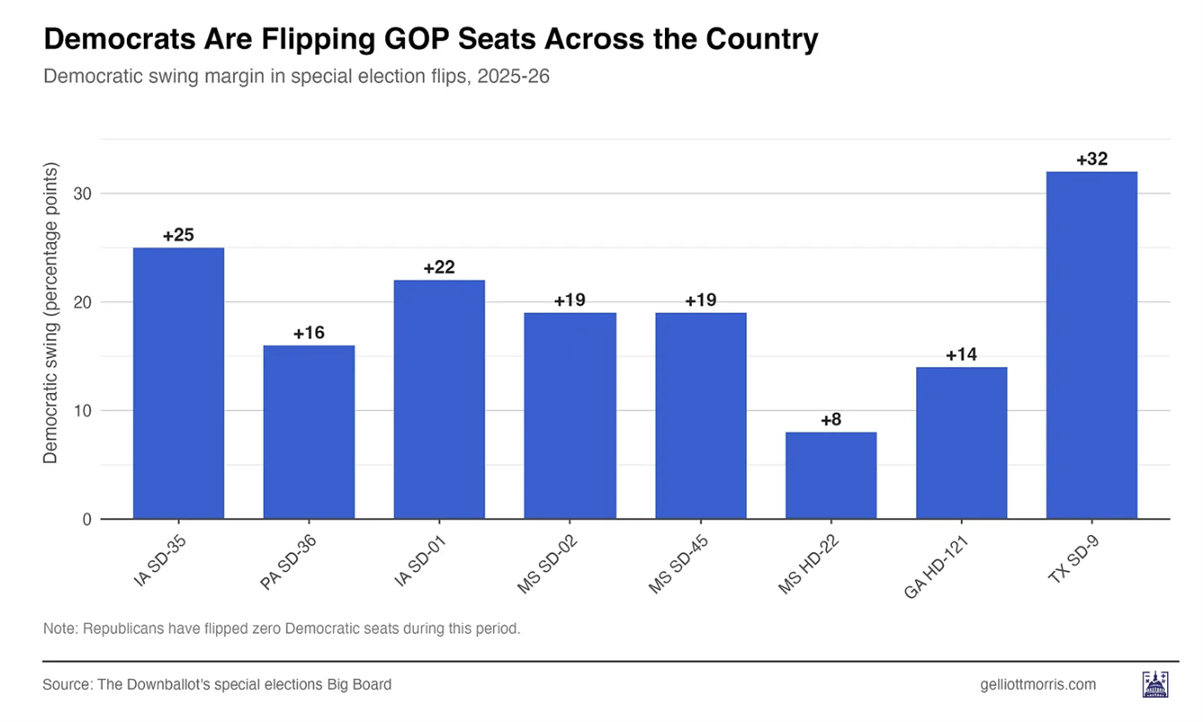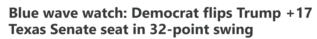 Det hele blev meget værre i weekenden for Trump og republikanerne, da en kandidat med 10x større budget og personligt støttet af Trump og trods flere registrerede republikanske vælgere på valgstederne end demokratiske, fik kæmpetæsk ved et special-valg i Texas med et resultat hele 32%-point dårligere (fra -15% til +17%-point) end ved præsidentvalget i 2024 (se graf nedenfor) og markant dårligere end andre specialvalg siden november 2024.