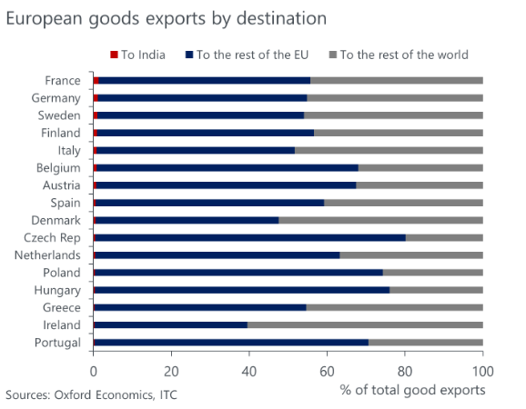 Spørgsmålet er selvfølgelig, hvor meget handelaftalen, ”the mother of all deals” med Indien kan booste væksten i Europa? Når man ser Indiens beskedne andel af Europas eksport, så kan man godt tvivle om den store væksteffekt.