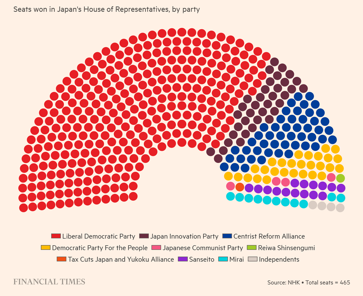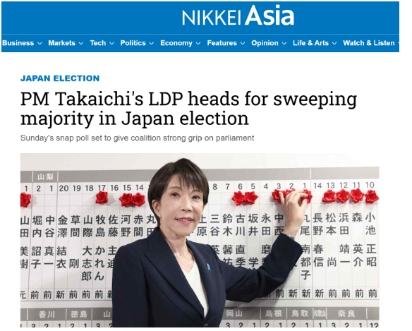 Japanske aktier stiger kraftigt (3-5%) her mandag pga. udsigten til en meget lempelig finanspolitik med bl.a. skattelettelser og højere forsvarsbudgetter. Yen'en er stabil, mens de lange renter stiger.