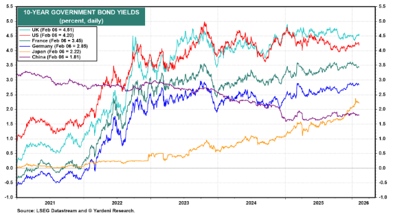 Det interessante globalt bliver, hvordan de allerede kraftigt stigende renter i Japan (orange linie i grafen nedenfor) reagerer i de kommende uger, fordi den lempelige finanspolitik kommer på et tidspunkt med en inflation på betydelige 3% og en meget lempelig pengepolitik med en kort rente på kun 0,75%.
