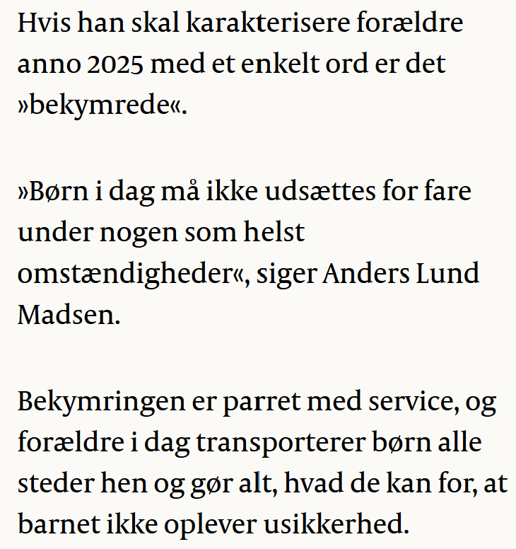 Min reflektion er, at det ikke kun er forældre anno 2025, der er mere bekymrede end tidligere, men os alle sammen – og ikke pga. klimaet, krigen i Ukraine m.m., men fordi vi i dag bombaderes med mange flere negative nyheder udover det med klimaet og Ukraine end nogensinde før pga. opmærksomhedskapitalismens behov for....opmærksomhed – og negative nyheder får mere opmærksomhed end positive.