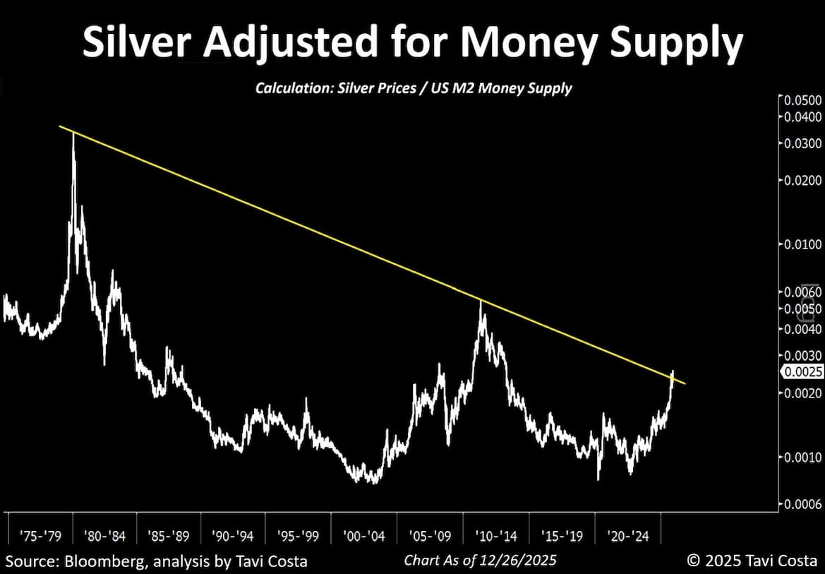 Otavio Costa fra finanshuset Crescat er en velkendt super-råvare-optimist, der forudser meget højere priser på fx. sølv, bl.a. fordi den nuværende sølvpris sat i forhold til pengemængden i USA stadig er langt under tidligere topniveauer.