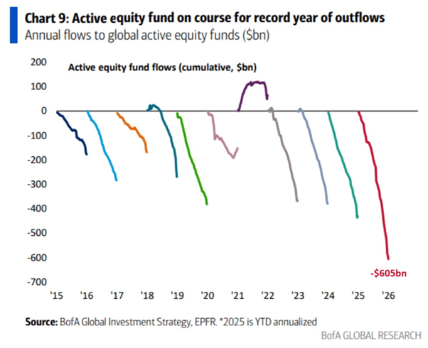 Hele 605 mia. dollars blev der trukket ud ifølge Bank of Americas data (Bloomberg har nogle lidt andre tal men helt samme tendens), så endnu flere penge nu blindt følger markedet uden selv at tage stilling til det enkelte firma der investeres i (nogle finanshuse mener den aktive andel reelt er nede under 20% nu, rekordlavt).