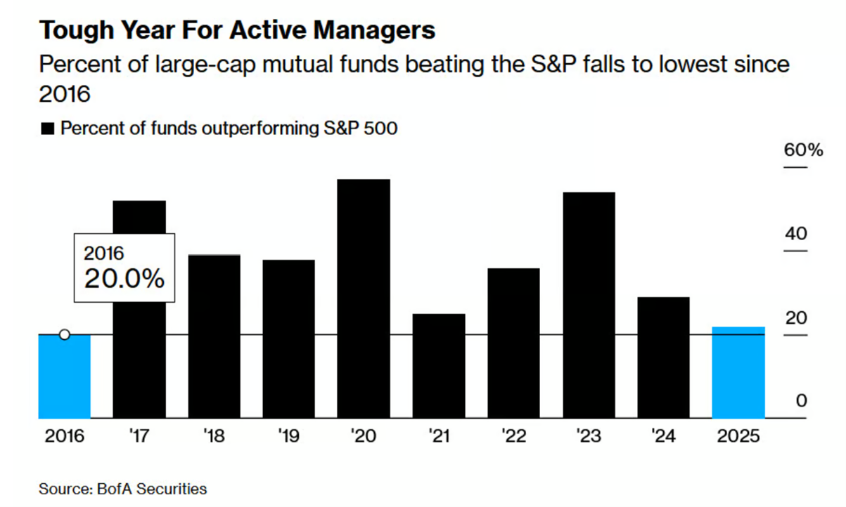 De mange flere penge i passive investeringsforeninger er en katastrofe for finansmarkedernes funktion som fordeler af penge til de mest produktive virksomheder. Men man kan ikke bebrejde investorerne, for kun 22% af de aktive investorer har slået markedsafkastet i år, den laveste andel siden 2016. Generelt har de aktive forvaltere haft det svært i snart en årrække.