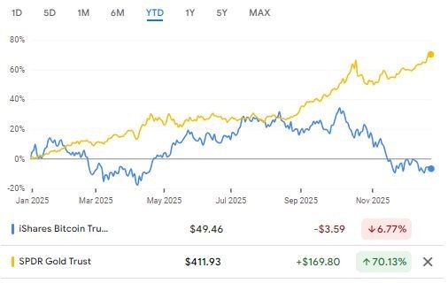 Andre bemærker, hvordan kryptovalutaer som bitcoin – det såkaldte ”digitale guld” – ikke har meget til fælles med guld i 2025, men tværtimod er faldet godt 7%.