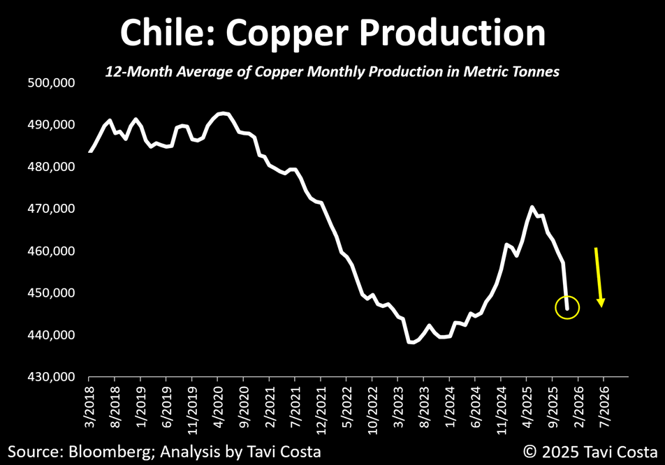- Mange års underinvestering i nye miner og derfor manglende udbud (se graf nedenfor med faldende kobberproduktion i Chile, en af verdens største producenter)