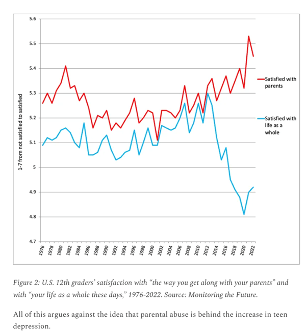 Nogle kommentatorer mener de kan læse effekten af os curling-forældre af grafen ovenfor (jeg er ikke så sikker). Argumentet lyder: Aldrig har vores børn været mere tilfredse med os forældre fordi vi har svøbt dem ind i lækre ferier og materiel velstand og flyttet alle besværligheder og pusse-nusset om dem op i en sen alder (eksempler som mor ringer til universitetet og brokker sig på sønnens vegne; henter søn/datter til fest få kilometer væk for det er farligt/hårdt at cykle; kører de unges udstyr til musikfestival for det er besværligt at slæbe, køber lejlighed til dem osv. – vi vil jo bare hjælpe 😊), men alligevel er de utilfredse med deres liv generelt fordi vi – sådan lyder argumentet - har flyttet alle ubehageligheder og modstand der ellers gør én stærkere som person at konfrontere.