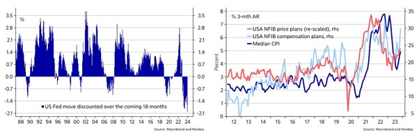 Én ting er dog indtil videre sikkert: De mildere toner og de seneste måneders kraftige rentefald mindsker risikoen for en recession/økonomisk nedtur i 2024. Men den øger til gengæld risikoen for en genopblussen af inflationen og en større økonomisk nedtur lidt længere nede af vejen. Se mere om implikationerne for finansmarkederne senere i ugebrevet.