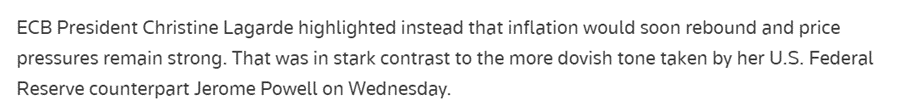 Udtalelserne faldt kun en måned efter, at hun i en analyse konkluderede (se tidligere ugebrev), at det ville blive vanskeligt at få inflationen det sidste stykke helt ned mod målet på 2% bl.a. pga. de høje aftalte lønstigninger og at ECB derfor skulle holde renten højt i lang tid.