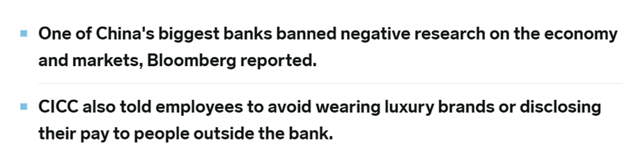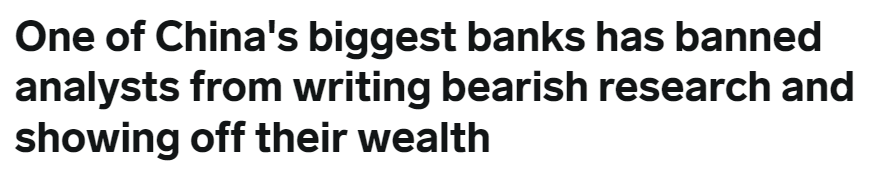 Kinesiske analytikere, både økonomer og aktiefolk, har også fået forbud mod at offentliggøre negative analyser af bl.a. kinesisk økonomi og aktiemarked (og at vise deres rigdom i form af dyre ure, jakkesæt m.m.)