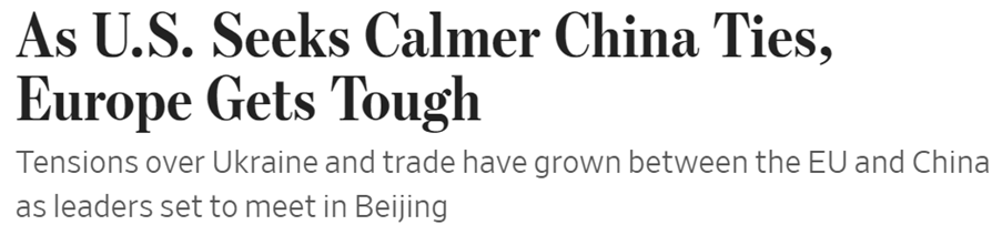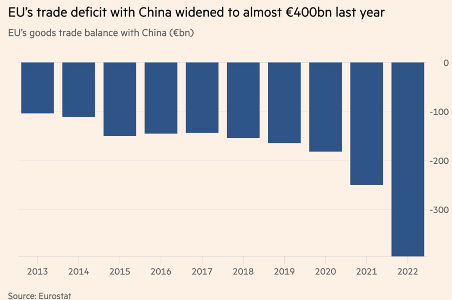 Mens USA og Kina prøver at komme på lidt bedre talefod med hinanden, så er EU stadigt mere sure på Kina pga. fordoblingen af EU’s handelsunderskud med Kina på bare to år til 400 mia. EUR (se graf nedenfor). Det var derfor et af hovedtemaerne på det første Kina-EU-topmøde i fire år afholdt i Beijing i forrige uge.