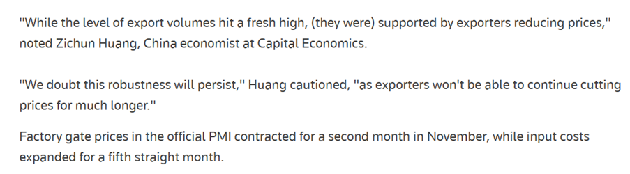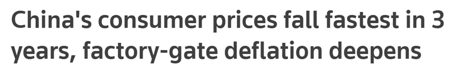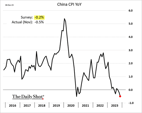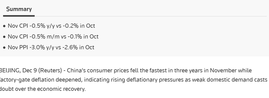 Inflationen i Kina målt ved forbrugerpriserne faldt fra -0,2% år-til-år i oktober til -0,5% i november, meget svagere end ventet. Målt ved producentpriserne faldt inflationen fra -2,6% til -3,0%. Altså er Kina i deflation, dvs. præget af negativ inflation = faldende priser. De store prisfald skyldes især lavere energi- og fødevarepriser, men andre priser aftager også.