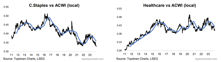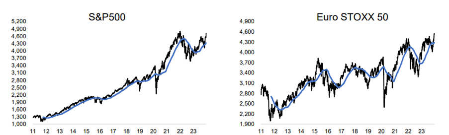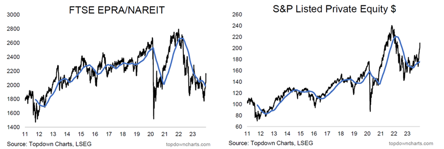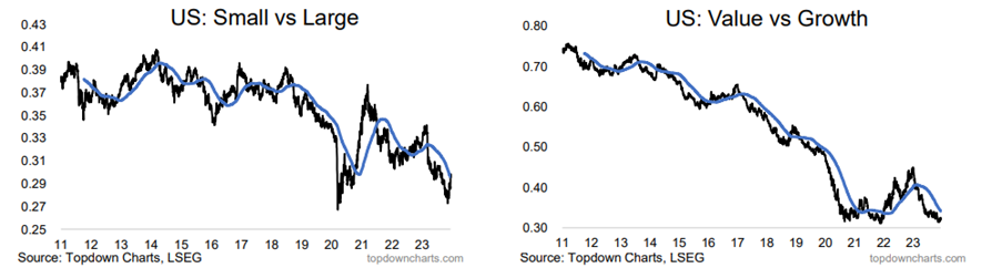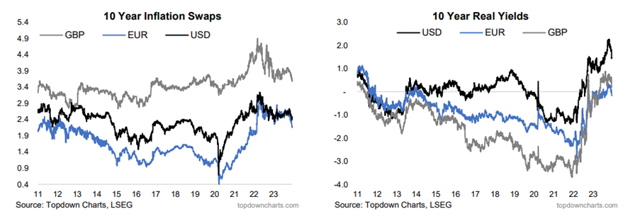 - Obligationer: Både lange og korte renter er faldet og ditto mht. realrenter og inflationsforventninger. Markederne forventer ca. 1,5% i rentesænkninger i 2024 i både Eurozonen og USA (første række grafer nedenfor)