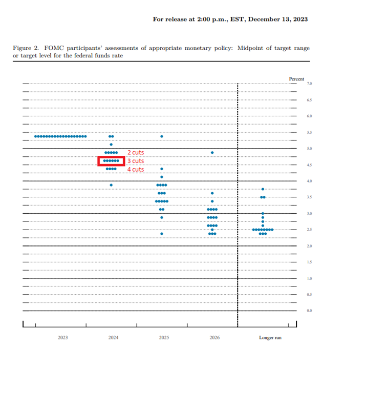 Til manges – også min – overraskelse fulgte Fed-chef Jay Powell efter med lige så milde toner nogle dage senere efter sidste uges Fed-rentemøde: Renten fastholdes på 5,25-5,50% men skal sænkes med 0,75%-point i 2024 og 1,0%-point i 2025 og forventning om blød økonomisk landing, lavere inflation end tidligere forventet og kun en lille stigning i den rekordlave arbejdsløshed. Alt sammen blot 11 dage efter han ellers i en tale havde lydt rimelig bidsk og afvist snakken om rentesænkninger.
