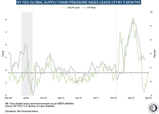 Grafen nedenfor viser en tæt sammenhæng mellem New York Fed’s globale mål for presset på de globale forsyningslinier og så inflationen 5 måneder senere.