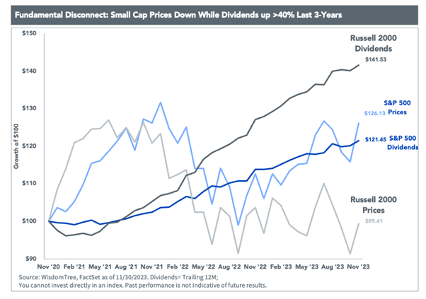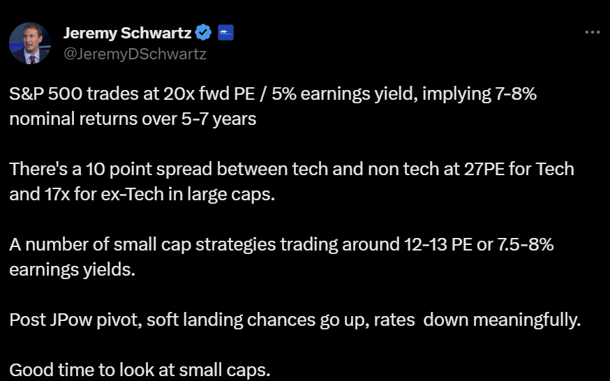 Flere finanshuse og investeringseksperter, bl.a. Jeremy Schwartz nedenfor (som jeg kun kan anbefale at følge), anbefaler netop at se nærmere på small cap aktier, der er markant billigere prisfastsat og har haltet markant efter kursudviklingen på de store aktier. Også selv om de har øget deres dividender mere de seneste år.