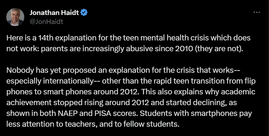 En anden forskere, Jonathan Haidt, kommer så med en 14. forklaring, men den du’r heller ikke: Dårligere relation mellem børn/unge og deres forældre. Tværtimod vurderes den som bedre de seneste år. Han mener også, at smartphones/SoMe forklarer dykket i skoleelevers PISA-score over hele OECD-området.
