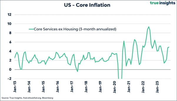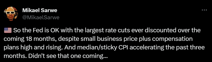 Nedenfor er fx. Nordea’s Mikael Sarwe, der bemærker, at flere inflationsindikatorer faktisk peger i den forkerte retning – opad – i USA, fx Powells egen favoritindikator ”core-services ex housing”. De seneste jobtal- og løntal og konjunkturbarometre for amerikansk erhvervsliv har også været ganske solide og for industrien er der tegn på opsving igen om få måneder.
