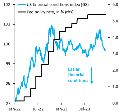 Kritikere af Powells bløde udmeldinger påpeger også, at de seneste måneder med kraftige rentefald og aktiekursstigninger svarer til, at Fed allerede har lempet pengepolitikken ganske meget målt ved det vi økonomer betegner som “financial conditions”, der er faldet til det laveste niveau siden sidste sommer.