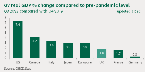 Væksten i Europa har længe haltet efter USA, især pga. en svag udvikling i Tyskland og til dels Frankrig og UK. Grafen nedenfor viser akkumuleret BNP-vækst siden 4. kvartal 2019.