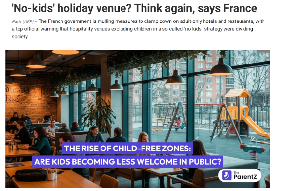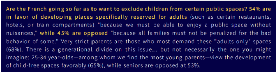 En undersøgelse viser, at 54% af franskmændene går ind for, at nogle offentlige områder må holdes børnefri: Hoteller, restauranter, tog-kupeer m.m. Det interessante og sørgelige: Hele 65% af de unge 25-34-årige er for børnefri områder.
