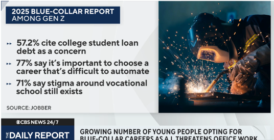 AI får flere i Generation Z i USA til at søge mod erhvervsfaglige uddannelser (”blue collar”), hvor den formodede konkurrence fra AI er mindre end i kontorjob (”white collar”).