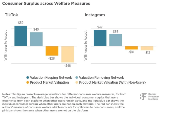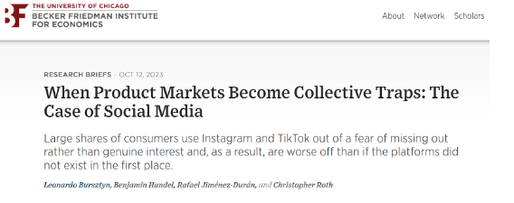 Jeg havde helt glemt nedenstående vigtige forskningsresultat, der blev offentliggjort for præcis to år siden, og som jeg også omtalte den gang. Den viser at mange forbrugere kun bruger TikTok og Instagram af frygt for at være udenfor (FOMO) uden at være reelt interesseret og derfor – påviser forskerne - er de faktisk villige til at betale en pris for, at både dem selv og deres omgangskreds ikke bruger de to sociale medier.