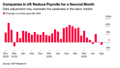 ADP-jobtallet viste en negativ jobvækst på 32,000 jobs i USA i september mod en forventet stigning på 50,000 og tallet for august blev nedjusteret med 57,000 jobs til nu at vise -3,000. Hele jobnedturen sker i de små- og mellemstore virksomheder, mens der fortsat hyres i store virksomheder, men næsten kun udelukkende i sundheds-sektoren.