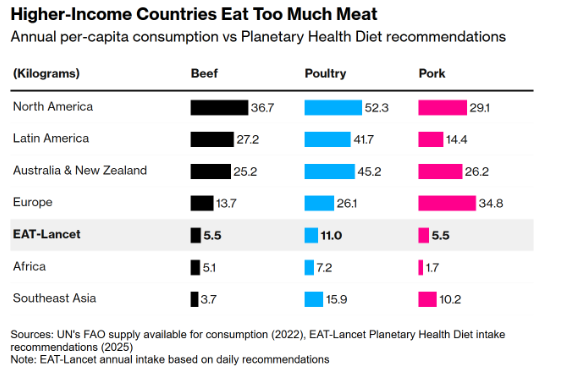 Opdateret Lancet-rapport om hvor meget vi skal omstille vores madvaner og fødevareproduktion af hensyn til klimaet viser igen-igen, at vi i Vesten skal skrue ned for kødspiseriet, mens det i dele af det globale syd skal øges. I Europa skal vi sænke oksekødsforbruget med 2/3 og svinekød med over 80%.