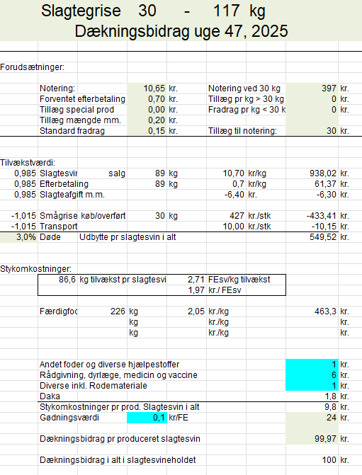 Priserne på grisene på 7 kg er efter beregnet notering. Prisen på 30 kg er halv pulje på PRRS-negative dyr og halv beregnet basispris plus et tillæg på 30 kr.