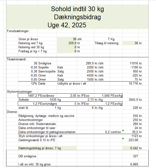 Priserne på grisene på 7 kg er efter beregnet notering. Prisen på 30 kg er halv pulje på PRRS-negative dyr og halv beregnet basispris plus et tillæg på 30 kr.