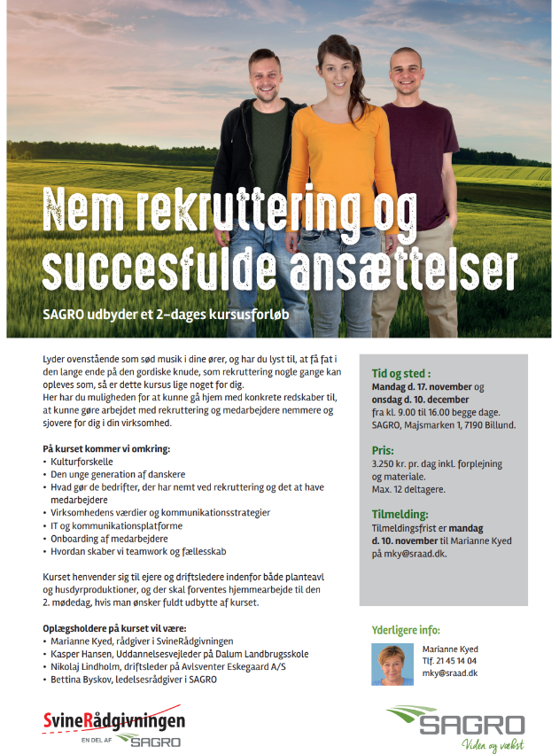 - Få nyttig viden om dig selv og dem du skal lede - Bliv bedre til at kommunikere til forskellige persontyper - Få redskaber til at håndtere konflikter - Bliv bedre til at skabe et godt miljø og en god teamspirit - Opnå bedre resultater sammen med dit team Hør hvad Christian har fået med fra kurset: ”Jeg har været på del 1 og 2 af SvineRådgivningens lederkursus og har haft en rigtig lærerig oplevelse. Jeg har fået mange gode værktøjer, som kan bruges i hverdagen til at lede og motivere forskellige medarbejdere og jeg har lært at sætte mig ind i, hvordan medarbejderne tænker og reagerer ud fra de forskellige personprofiler – og hvordan de skal håndteres i forskellige situationer. Udover det har jeg fået et stort indblik i de forskellige kulturer og nationaliteter, som arbejder i landbruget, og hvor vigtigt det er, man tager sig af den forskel, der er. Under kurset har jeg også lært meget om mig selv, og hvordan jeg er som leder og person. I del 2 af kurset har vi lavet en DISC-profil, der er et rigtig godt værktøj at have i forhold til at vide, hvordan man er som leder og hvordan andre ser en i dagligdagen.” Christian Dalstrup, driftsleder