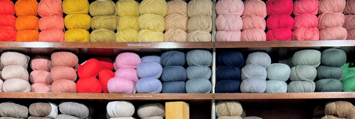 Vi holder til i en ældre bygning, og vores lager er fordelt på to etager, som man bevæger sig meget rundt på i løbet af en vagt, og flere steder er der lavt til loftet. Vi er en travl butik der ofte er fyldt med kunder, og der er derfor hele tiden noget at tage sig til - og altså ikke tid til at strikke (hvor end vi gerne ville!)
