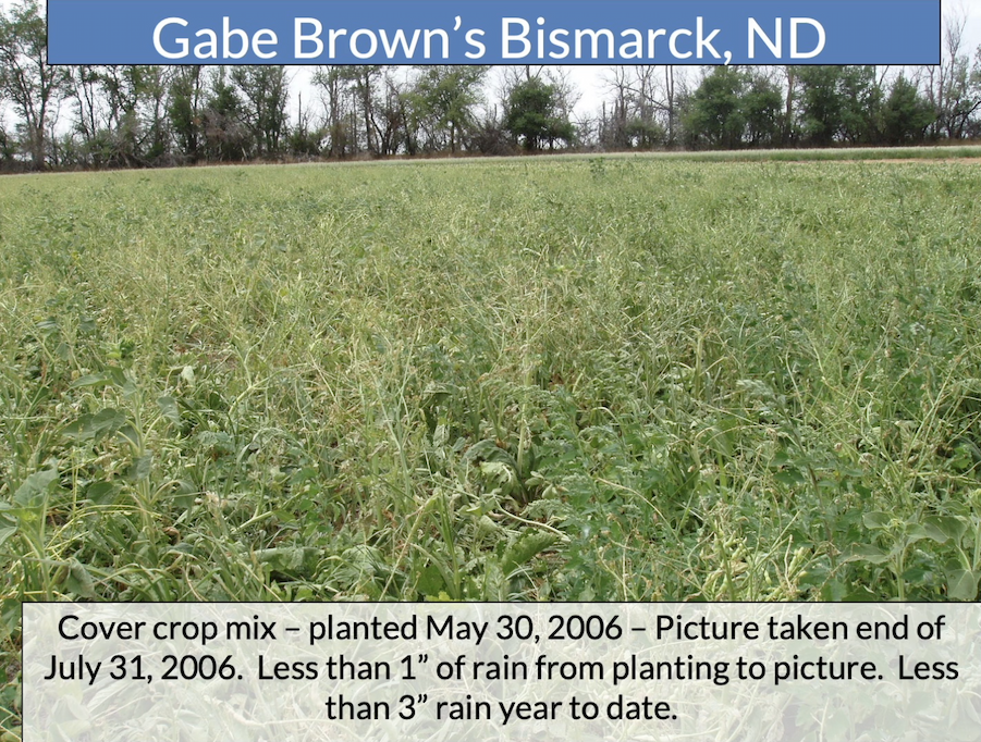 Their findings were validated by the studies done on Gabe Brown’s farm. In a very dry year where only an inch of rainfall was received during experimentation, Gabe’s experiments demonstrated that cover crop mixes use water much more efficiently and can produce a lot of biomass with minimal rainfall.